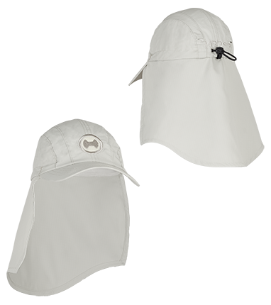 HYPHEN - Mikrofaser aus Polyester, schützt Nacken, Ohren und Gesicht, lässt sich durch einen Gummizug mit Kordelstopper der Kopfgröße optimal anpassen, atmungsaktiv, Salz- und Chlorwasser resistent, trocknet sehr schnell. Wird der Nackenschutz nicht benötigt, einfach den Stoff nach innen in die Kappe legen.